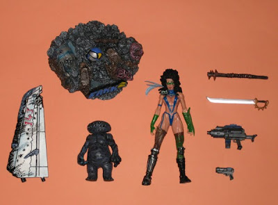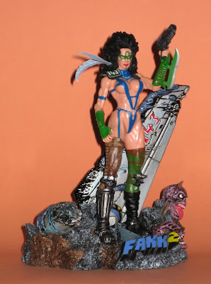 Figura pertencente à colecção exclusiva da Moore Action Collectibles inspirada no filme de animação ‘Heavy Metal 2000: F.A.K.K.²’. Versão alternativa “biquini azul” com boneco extra articulado: o pequeno humanóide Zeek. Tamanho aproximado 15 cm. 7 pontos de articulação. Linha minuciosamente esculpida por Clayburn Moore com base nos traços físicos da “playmate” Julie Strain. Item numerado: 03536. EDIÇÃO LIMITADA! Sem embalagem original. Acessórios completos: base-diorama + clava com picos + espada + pistola automática + metralhadora com duplo carregador. Manuseamento mínimo.